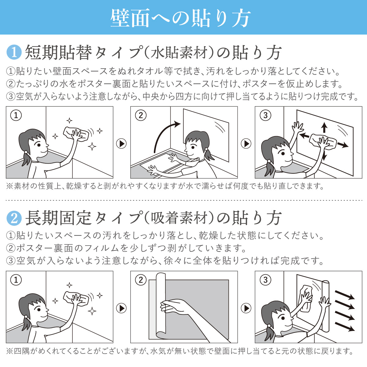 ①壁面をぬれタオル等で拭き、汚れをしっかり落としてください。②たっぷりの水をポスター裏面と壁面に付け、仮止めします。③空気が入らないよう注意しながら、中央から四方に向けて押し当てるように貼りつけます。